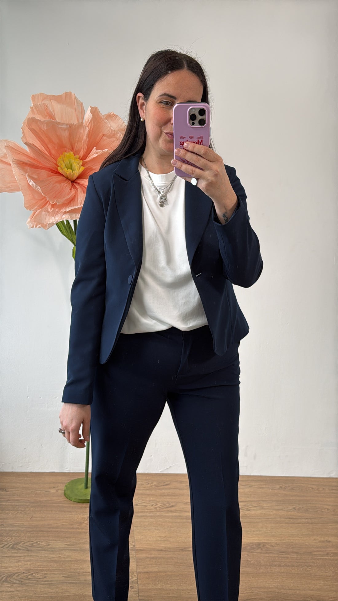 Completo a taglie composto da: Blazer taglio regolare e pantalone a sigaretta Composizione tessuto 88%...
