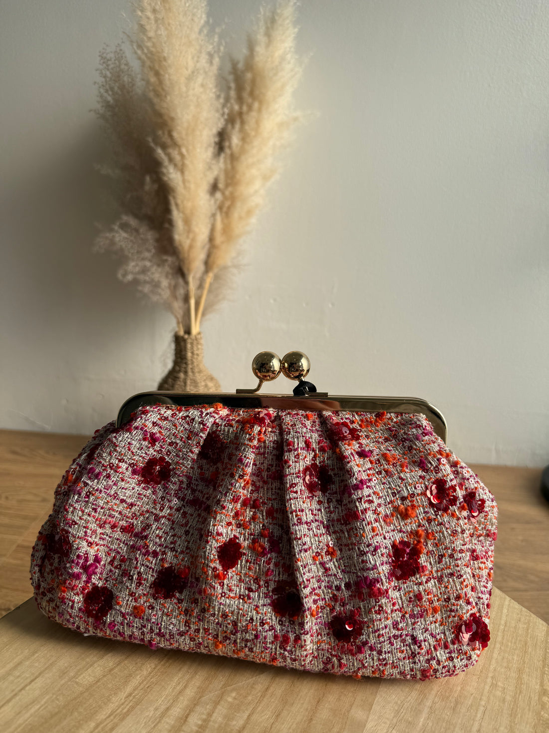 Pochette di media grandezza con chiusura dorata A scatto decorata con fiori di paillettes Tessuto...