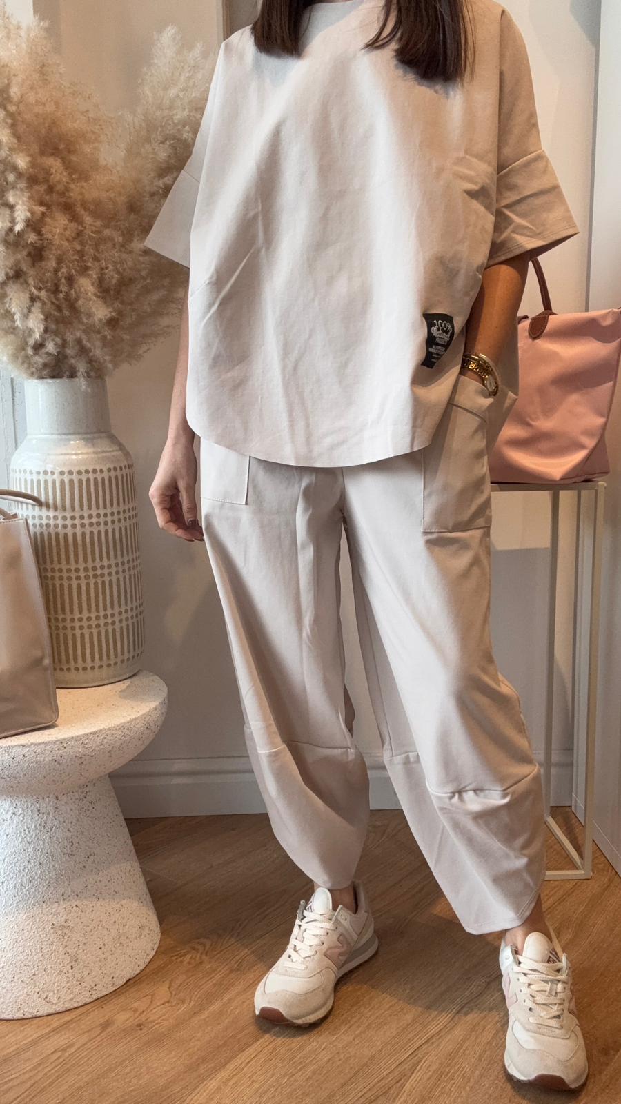 coordinato taglia unica con vestibilità over dai tagli asimmetrici Compisizione 65%cotone 30%poliammide 5%elastan La maglia si presenta...