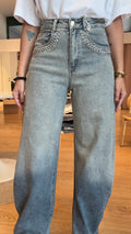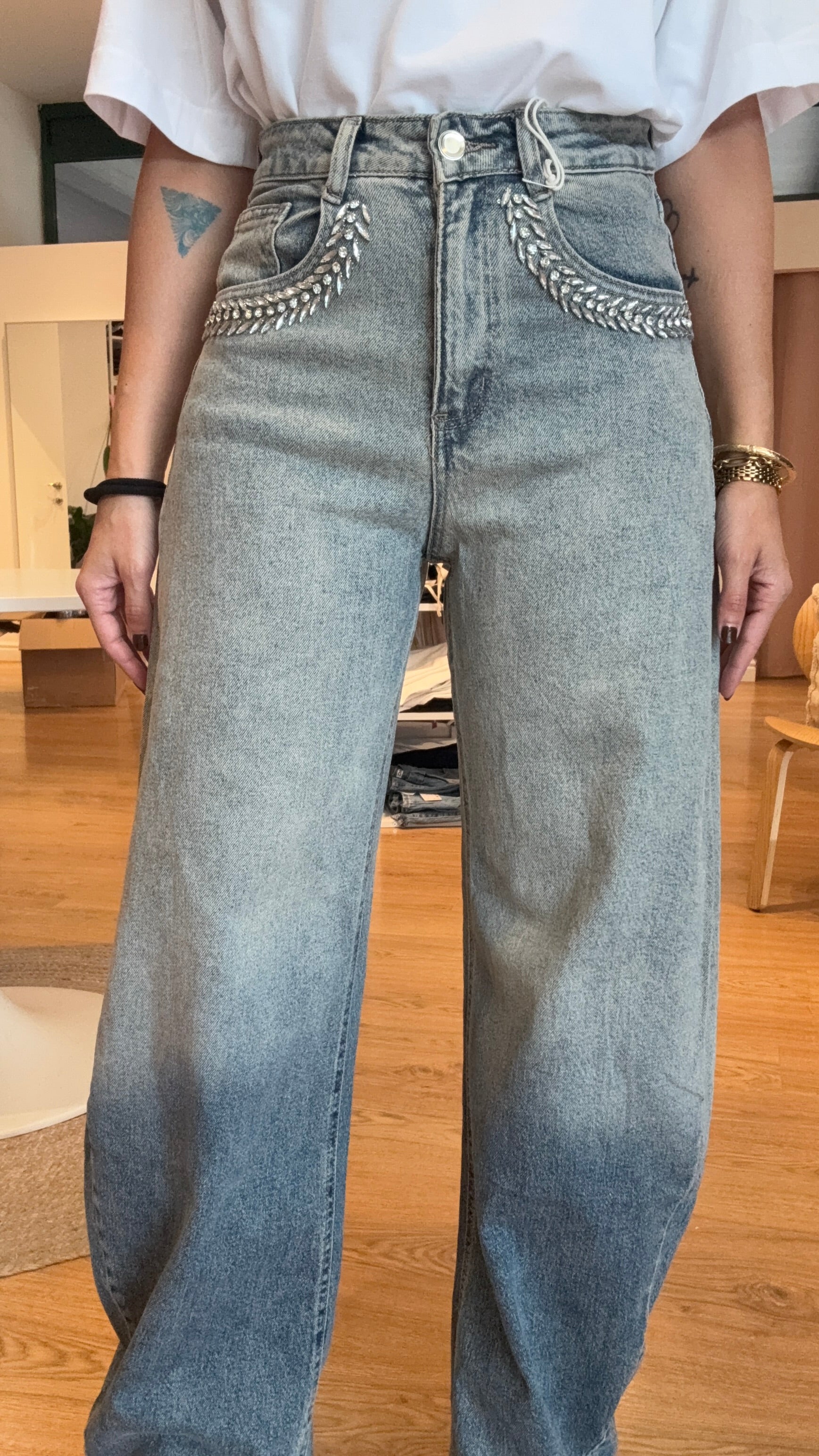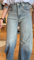 Denim 5 tasche con strass cuciti che contornano le tasche davanti del jeans
