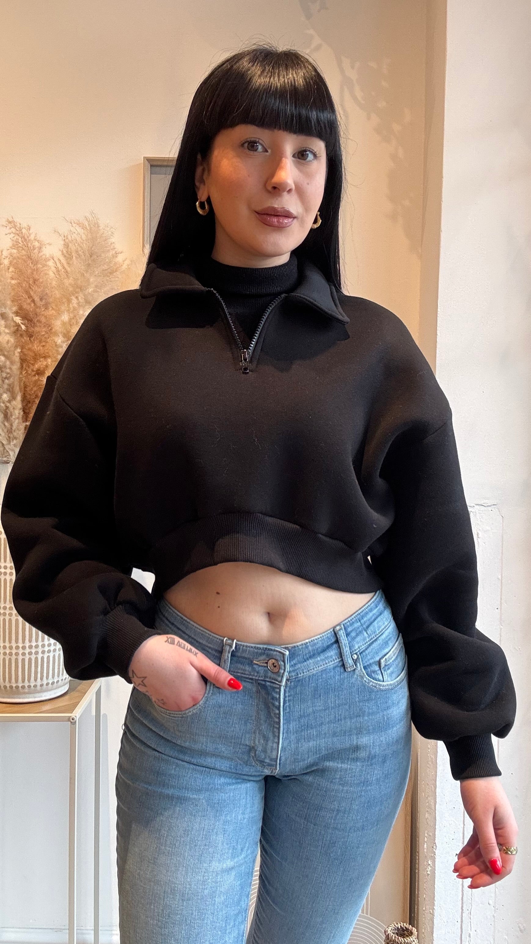 Felpa Crop taglia unica felpata con colletto e cerniera