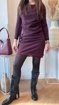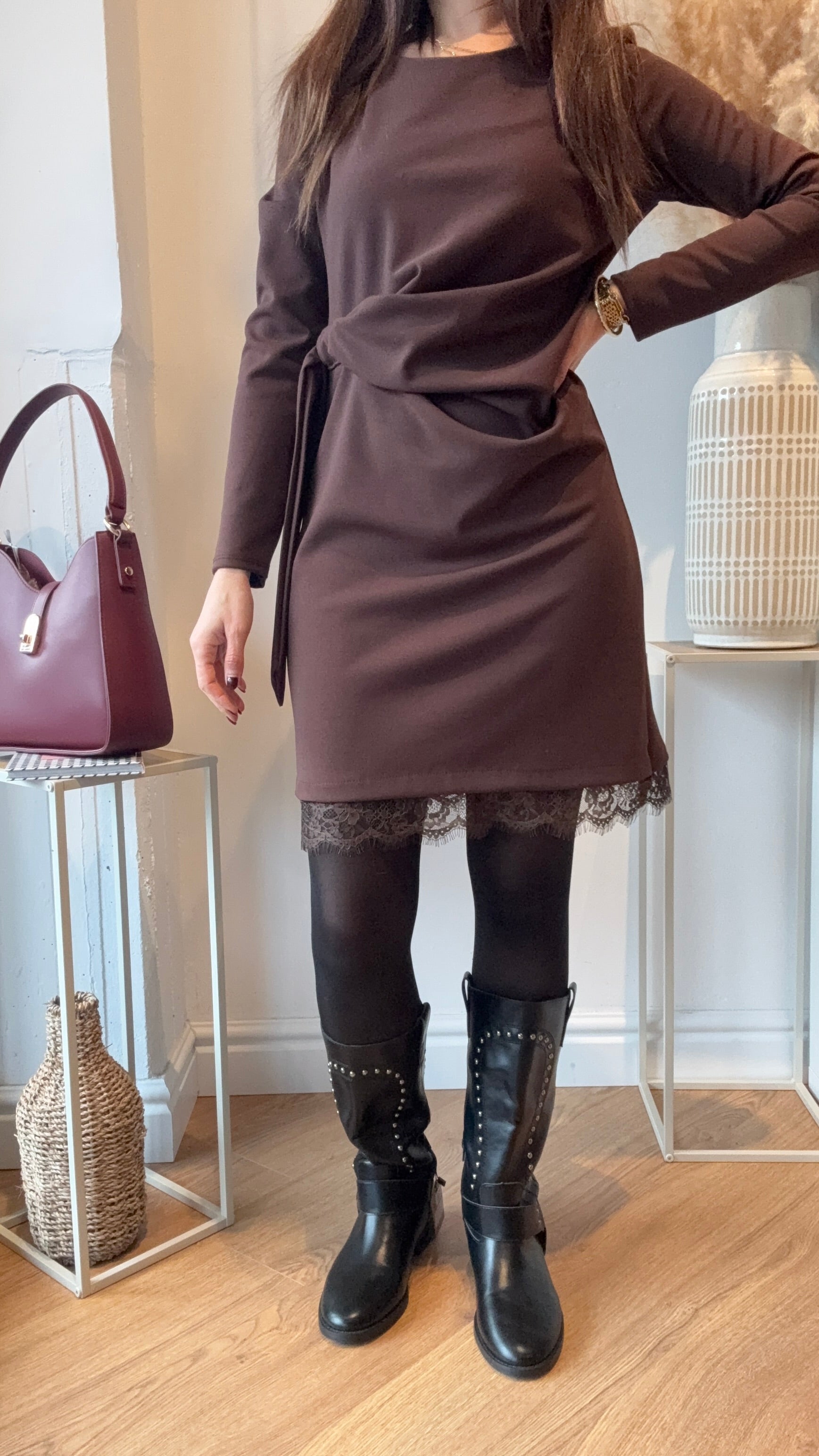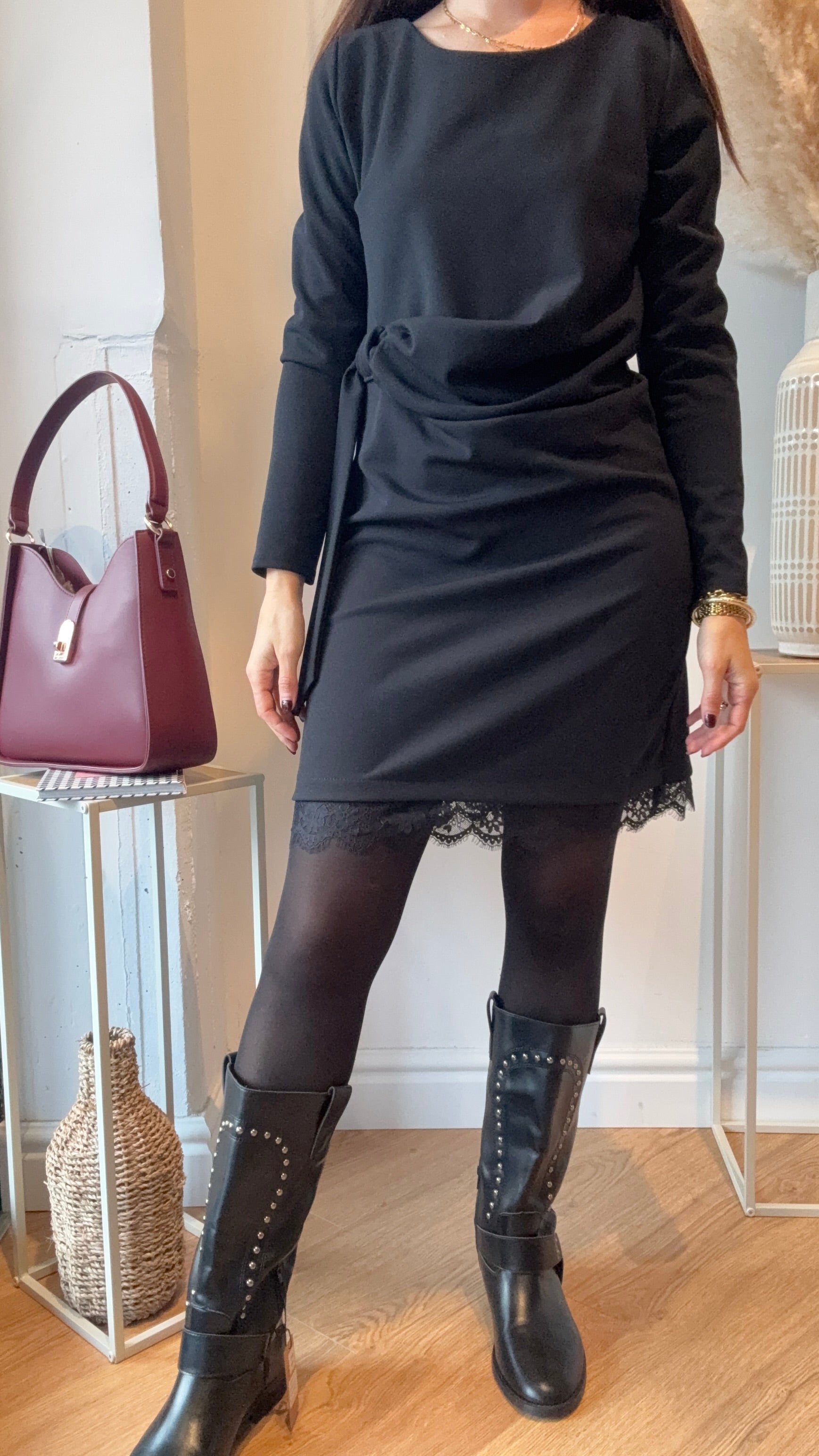 Abito elegante e confortevole, con drappeggio laterale che valorizza la figura e orlo in pizzo che aggiunge un tocco femminile. La lunghezza sopra il ginocchio lo rende perfetto per il giorno e la sera.