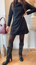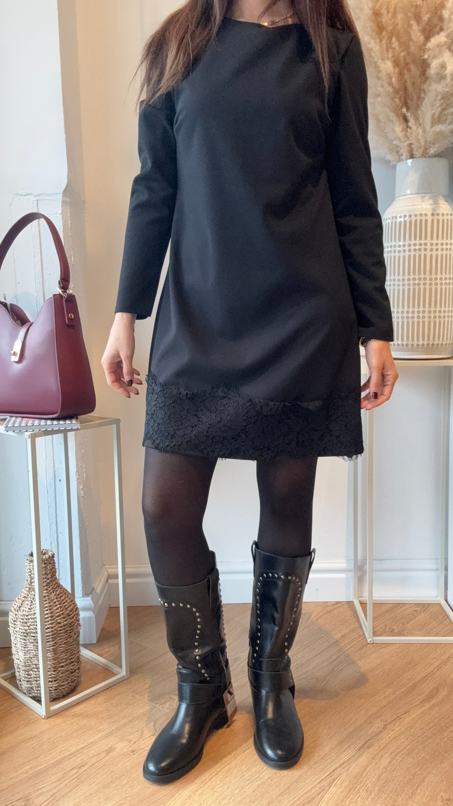 Un abito nero elegante e senza tempo, impreziosito da una gonna in pizzo che dona movimento, femminilità e un tocco sofisticato. La parte superiore è pulita e minimale, mentre la lavorazione in pizzo nella parte inferiore crea un contrasto raffinato che lo rende perfetto per ogni occasione.
