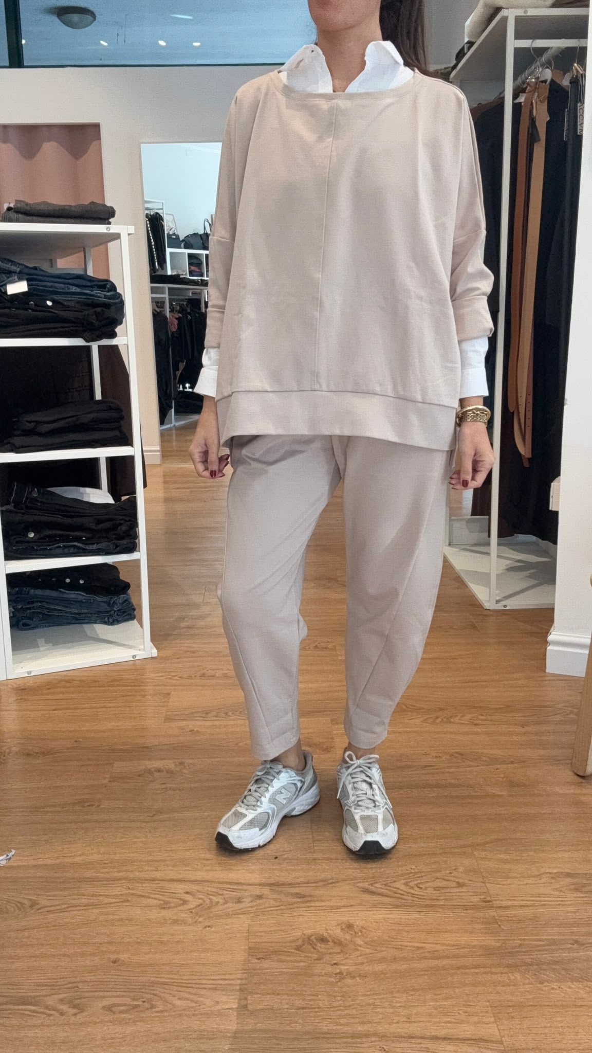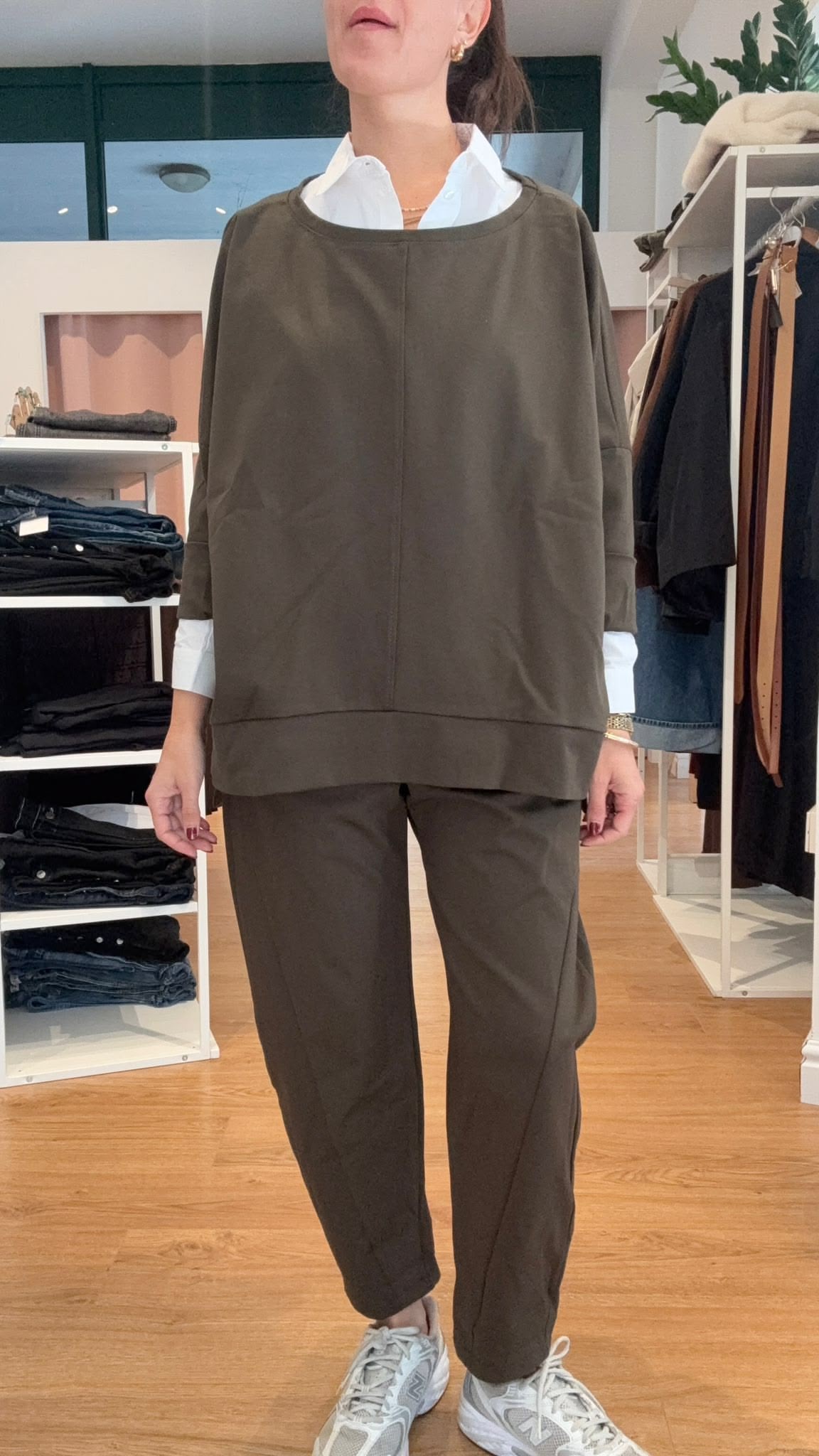 Tessuto in felpa effetto punto milano; la felpa più lunga nella parte dietro. Il pantalone ha elastico in vita molto morbido.
