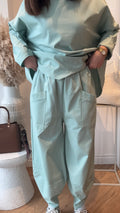 Il pantalone con elastico in vita e tasche applicate, lunghezza alla cavilglia con il fondo con chiusura a bocciolo