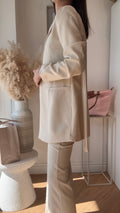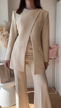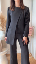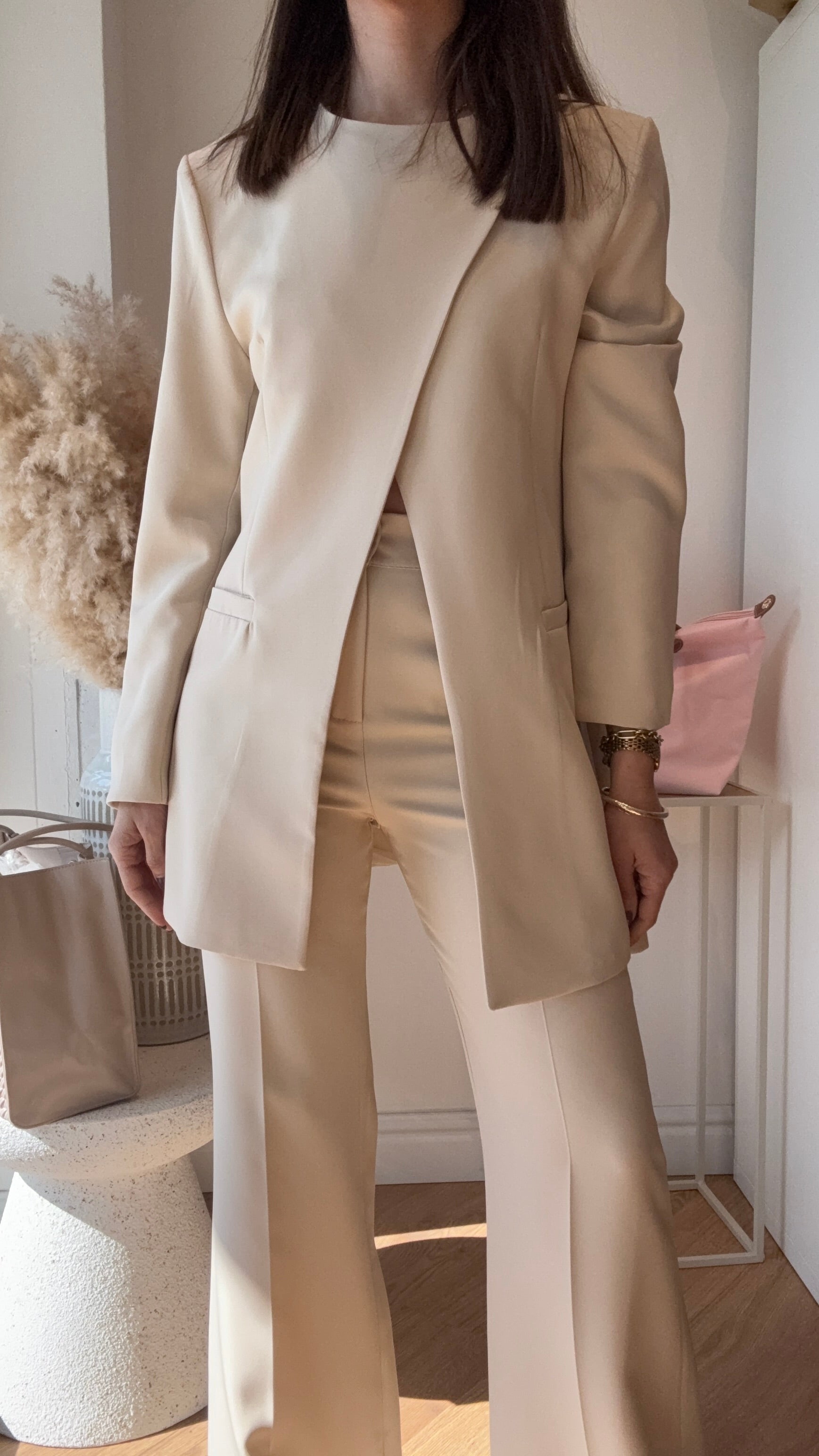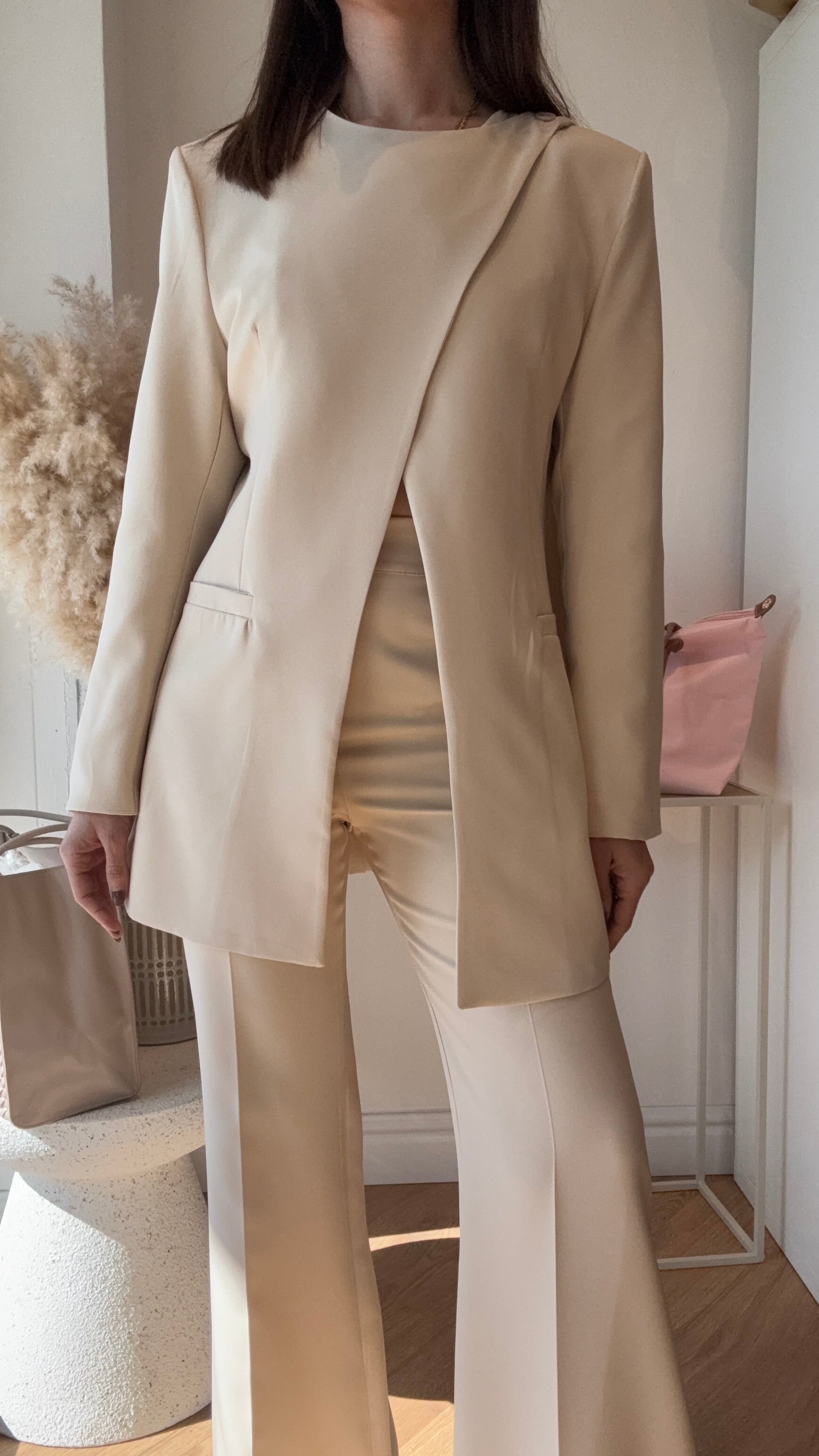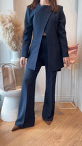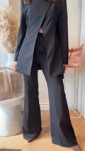 Tailleur  taglia unica composto da blazer asimmetrico e pantalone taglia unica a zampa con elastico in vita e bottone cerniera